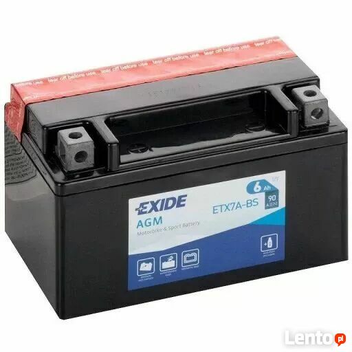 Akumulator motocyklowy EXIDE ETX7A-BS YTX7A-BS 12V 6Ah 90A EN L+ imponuje swą niezawodnością i trwałością dobrze znosi mroźne zimy i inne trudne warunki pogodowe. Akumulator jest w pełni bezobsługowy. Wykonany został w technologii AGM i pasuje do większości zastosowań, w tym do skuterów wysokiej klasy, motocykli, kładów, kosiarek, skuterów wodnych i śnieżnych. Co więcej akumulator ten może pracować w wielu pozycjach (nie tylko w pionie) bez ryzyka rozszczelnienia.